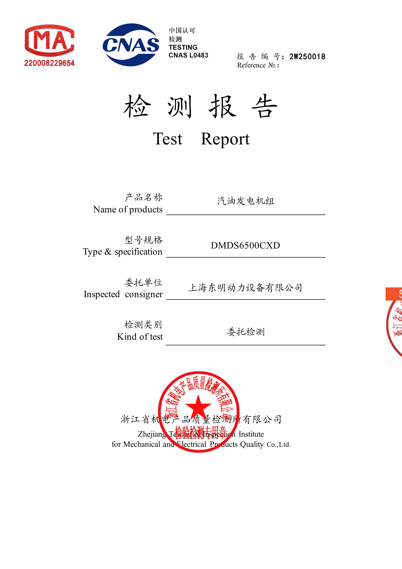 作為專業(yè)發(fā)電設(shè)備,上海東明 DMDS65000CXD 已通過(guò)檢測(cè)機(jī)構(gòu)浙江省機(jī)電產(chǎn)品質(zhì)量檢測(cè)所檢測(cè)認(rèn)證,具備完整的檢測(cè)報(bào)告,在品質(zhì)把控上表現(xiàn)突出: